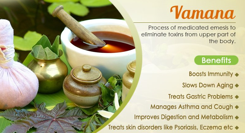 Later, Sushruta, the legendary surgeon, and his school of Ayurveda combined the last two Vasti (Enema) techniques into one, and added Raktamokshana (blood-letting) to the Pentads of Panchakarma. He believed that since impurities in blood are a major cause of illness in their own right, including a technique to purify blood in the Panchakarma is important. Vamana Vamana Chikitsa, or Emesis Therapy, involves controlled, medically-induced vomiting. It is aimed to eliminate excess Kapha Dosha in the body which can otherwise trigger a series of ailments like acne, asthma, arthritis, chronic cold and diabetes. It is not advisable to give this treatment to children, the elderly, pregnant women or people suffering from tuberculosis or hepatitis. Initially, the patient is given Purvakarma, or preparatory therapy, for three to seven days. Both internal and external oleation are done with medicated ghee or oil and the patient is made to sweat intensely. This directs the excess Kapha to build up in the stomach. Afterwards, Pradhanakarma, or main therapy, is given to expel excess Kapha from the body. Patients are made to consume items such as black gram and sesame that increase Kapha, and herbal concoctions like Madana (Randia Dumetorum) to induce vomiting. Usually, expulsion of Kapha begins within 30 minutes of ingestion, and the emesis subsides on its own after six to eight such episodes. Paschatkarma, or rehabilitative treatment, is prescribed after Pradhanakarma. The patient follows a special diet, avoids loud speech and exposure to sunlight, and takes adequate rest.